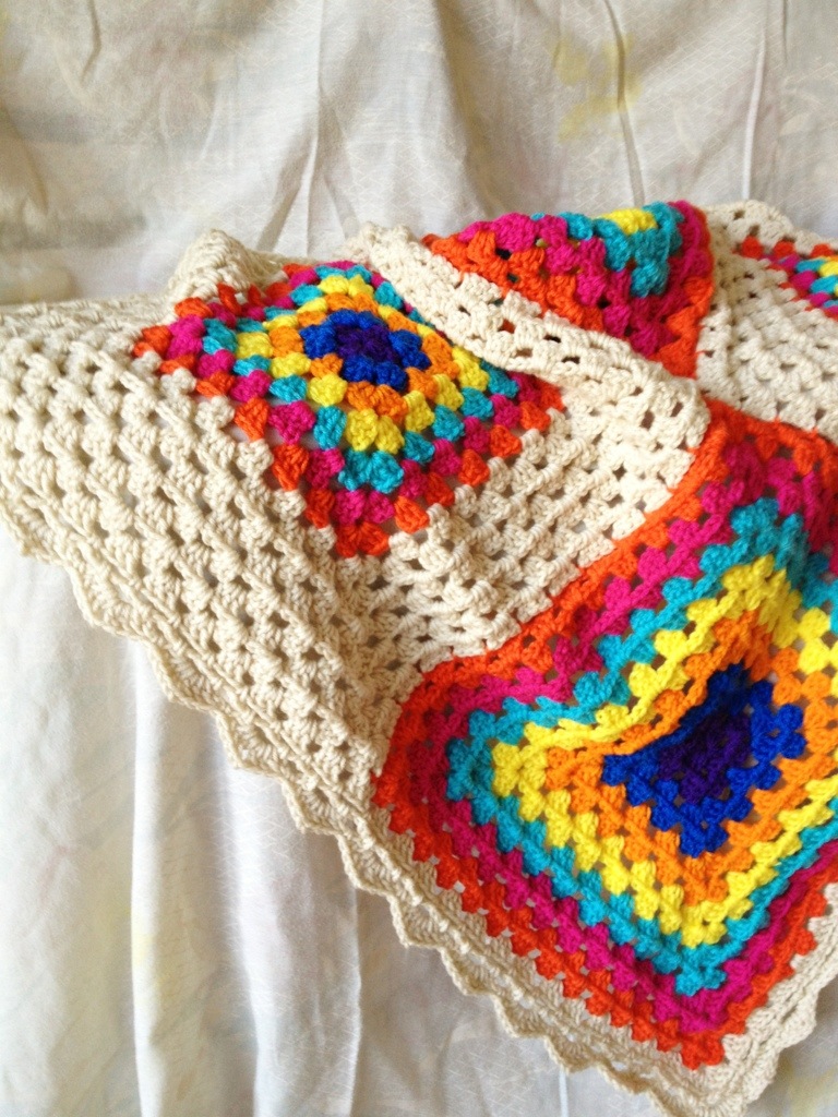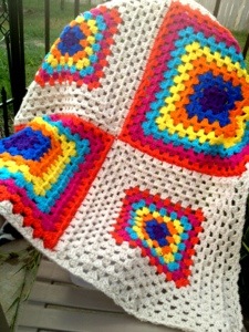 I made this version of the Four Square blanket as a prototype – It’s so bright and fun!