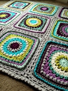 When all motifs are joined, work CH2 spaces all around border of blanket, decreasing 2 spaces together where two square corners meet (Internet Search “No-crinkle granny square border” for a great tutorial) and working SC, CH2, SC in 4 corners of blanket.