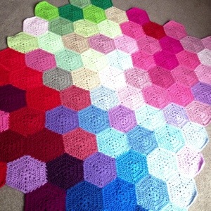 I drew inspiration for my first few hexies from my Sew, Ray, Me bag – Rachael does a fabulous job and I bought a bounty of goodies from her to hold projects, notions, hooks, and anything else that I fancy! Although these are “complete” motifs, I will still be joining as I go. These hexes will be absorbed by the adjacent ones – I just wanted to get a feel for the color palette.