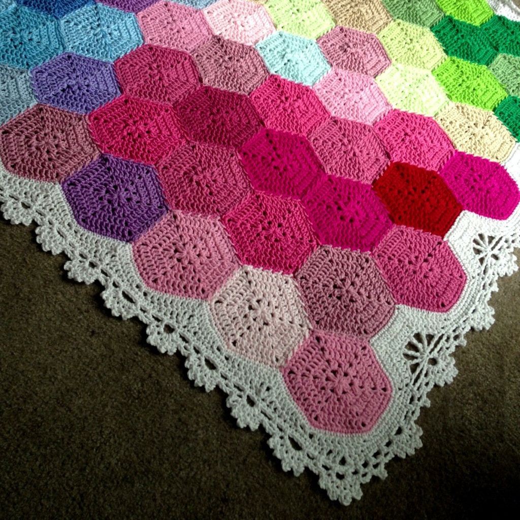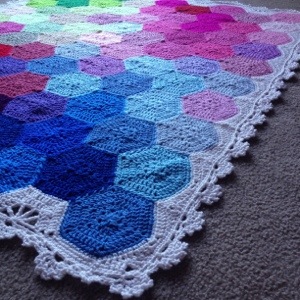A dainty lace tops it off! Each time that I have done this blanket, I have made a different lace. It really is simple to come up with once you get the general principle of defining the lace repeat. I love the border. The soft white does not detract from the pastel, bright, and dark mix of colors.This one may be my favorite yet!