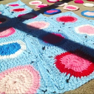 I started these pretties in colors that I pulled from sample photos of the girl’s(very cute!) bedroom. Making the Gumball blanket in this thick style is very eye-pleasing. The chunky circles come out great with the star border.
