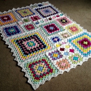 This version of Gelato is the original design, but I call any blanket with chunky, different sized granny squares a Gelato. I happened to use 3DC clusters on these squares and I did not flip them on every round like I sometimes will. I create the squares using remnants, and join as I go.