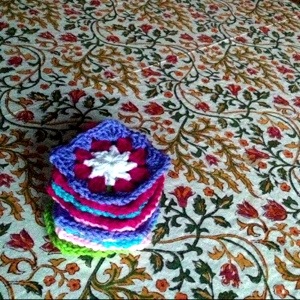 a) In Framed Garden 5, I accidentally made a mistake that resulted in a pleasing change of more color per granny square (and less white border). Also, it gave more structure to the squares. I’ll be keeping the “mistake”!