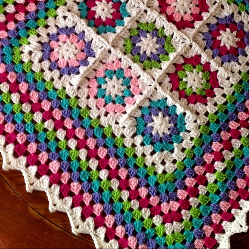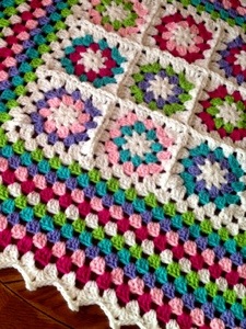 I decided to mix it up a little by changing the granny squares slightly and reversing the color order of the wide frame so that the pink was on the outside. Framed Garden 5 is the fraternal twin to this blanket 🙂