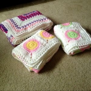 And a shot of all three blankets together – the pink and purple one is for the big sis! π