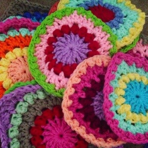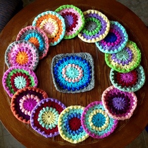 Below, you will find all my pretty kiddoes in a colorful circle dance (except for the one that got left behind on the couch.. there are sixteen motifs total).