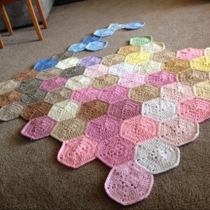 I wrote this pattern to join-as-you-go, so these completed hexes will be “absorbed” into the blanket by joining other motifs around all six sides. Also, if I have no other modular/portable projects to schlepp around my town, then I’ll work a few hexes in each color and just absorb them all into the blanket. Worst case scenario, I have to pick back my last round and join. No biggie! Okay, so I have my four main colors chosen. Now what?