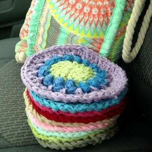 I completed a healthy dose of these nine squares in the car-rider line at my eldest daughter’s Elementary School. Once you get past the third color, the square is smooth sailing.