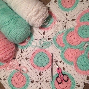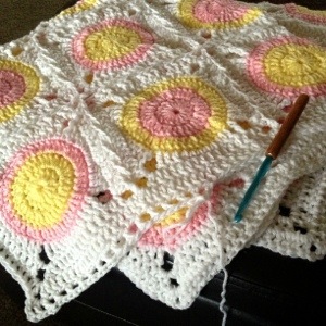Progress shot – this blanket works up so quickly, especially because as a 48″ square, I only need 25 motifs.