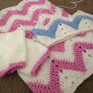 I start with a method similar to my Chevron blanket pattern, but I use a special technique that allows me to only finish off two ends (instead of 12!) for the six triangles that make the bottom edge.