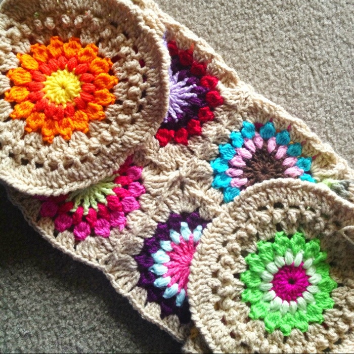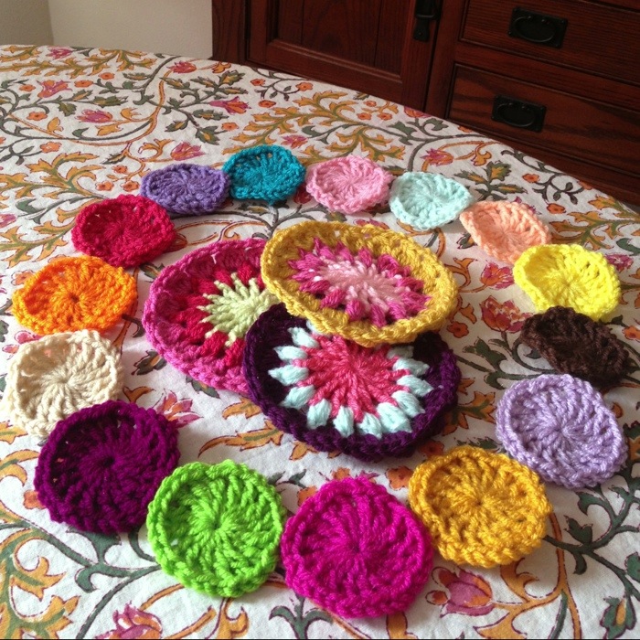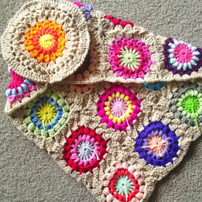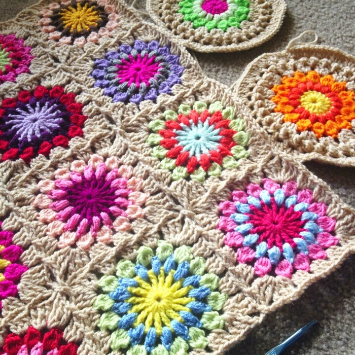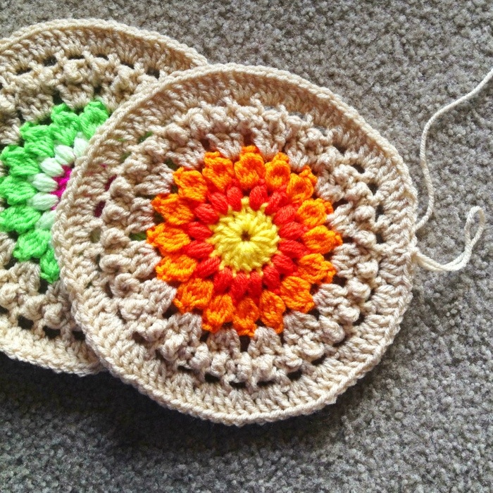 The Sunburst Granny cushion cover began its life as 18 pretty circles (16 for the body and 2 for the sides).