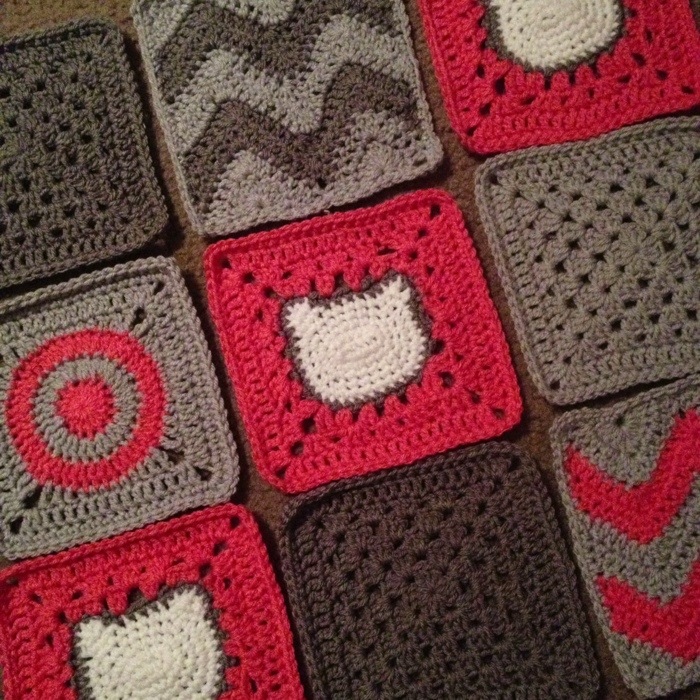 I mixed up the HK square with six other delights – three neat and traditional grannies, two mini-chevrons, and a pinky bulls-eye shape! Grey has been in my soul as a neutral since I began BabyLove Brand, and I really let it set off the tropical pink here.