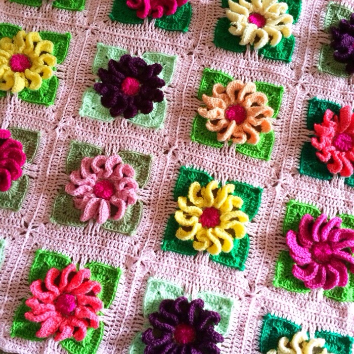 It is a great joy to make these 3D flowers. They do take more materials, but it’s worth it as it makes for a very warm blanket. I used a DK yarn for the background to take some of the weight off since the daisies are heavier.
