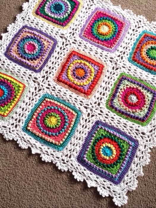 - Construction: 9″ squares with a lacy join and simple lace border – love!