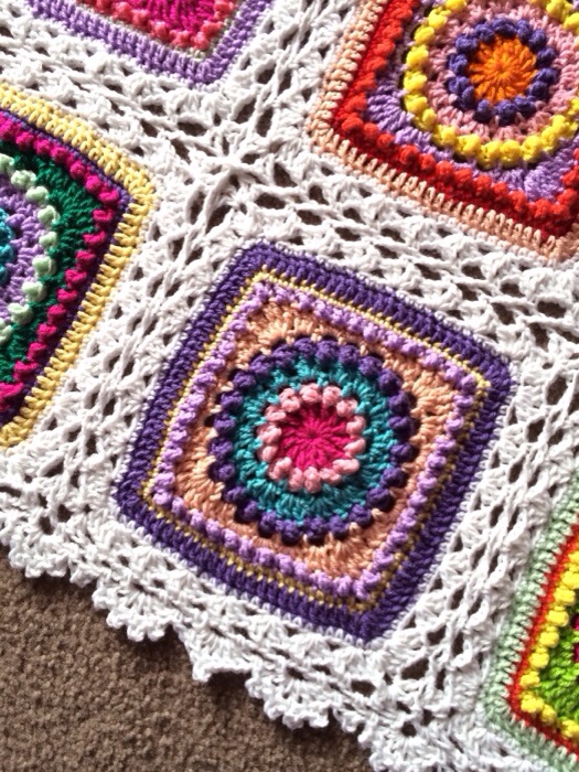 The join that I used here can be found in the free pattern for this blanket. It is like a flat braid join, but with the pointed shell round coming before the braid. The tricky part for this one was working out the edging…