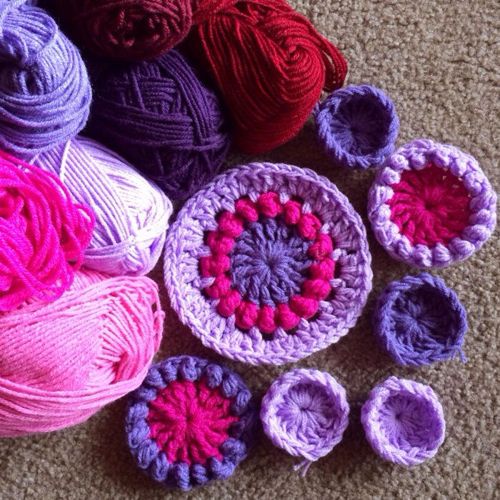 Loving this color combo. I added the flower from the Babouska Rose blanket and basically just looped 16 chain loops around the back of the final round of petals. then I just started from the next round of the Textured Circles pattern. I love how this came out, and I’ve already experimented with a J hook and one strand DK yarn and it is absolutely gorgeous. I’ll post that experiment soon! 🙂