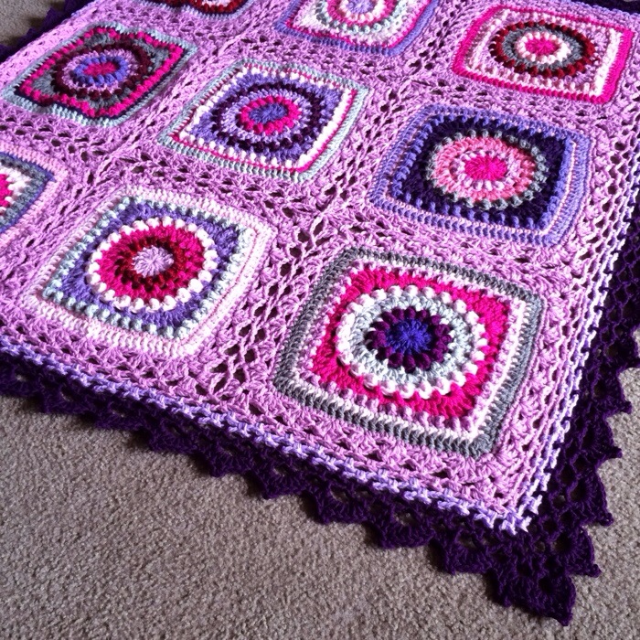 • Materials: Mostly Hobby Lobby “I love this yarn” – The purple background is Bernat “Big Ball Baby Softee”, and I have mixed in some New Fashion DK as well – yarn held double for extra thick blankets – Size 10mm hook