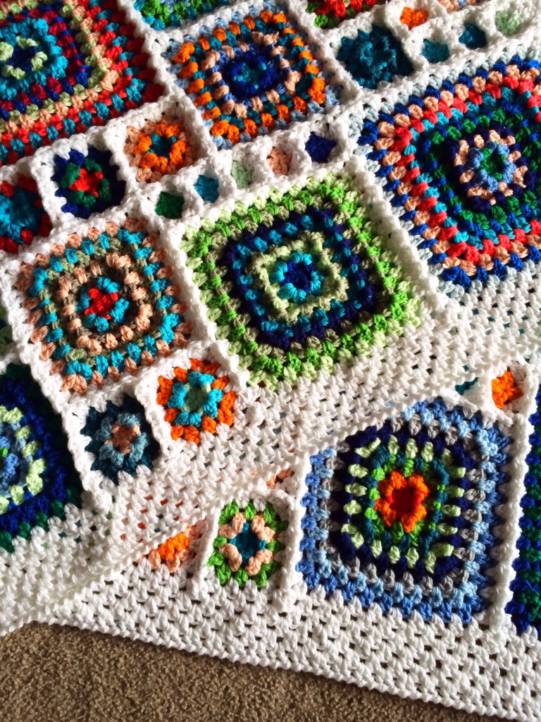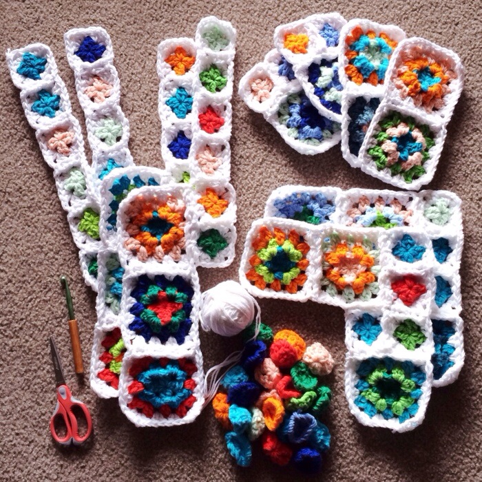 - Construction: Different size granny squares joined together based on a planned layout – pattern describes joining in detail!