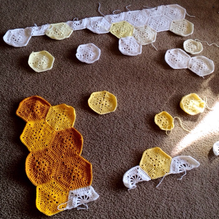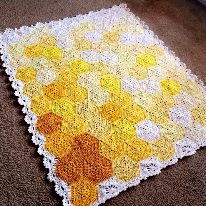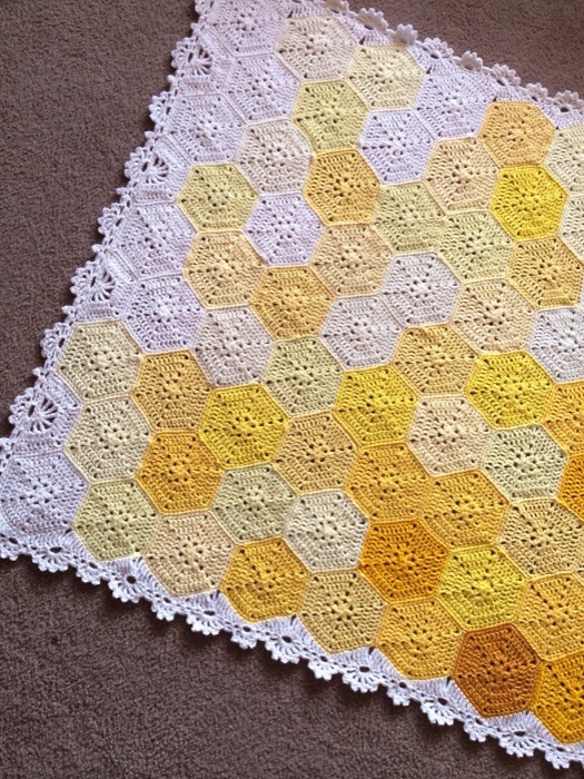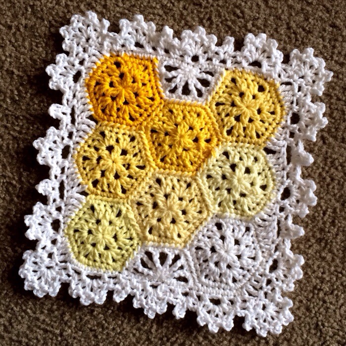 • Construction: Hexagons joined as you go, squared off with a crisp white lace border that really sets off the yellow!