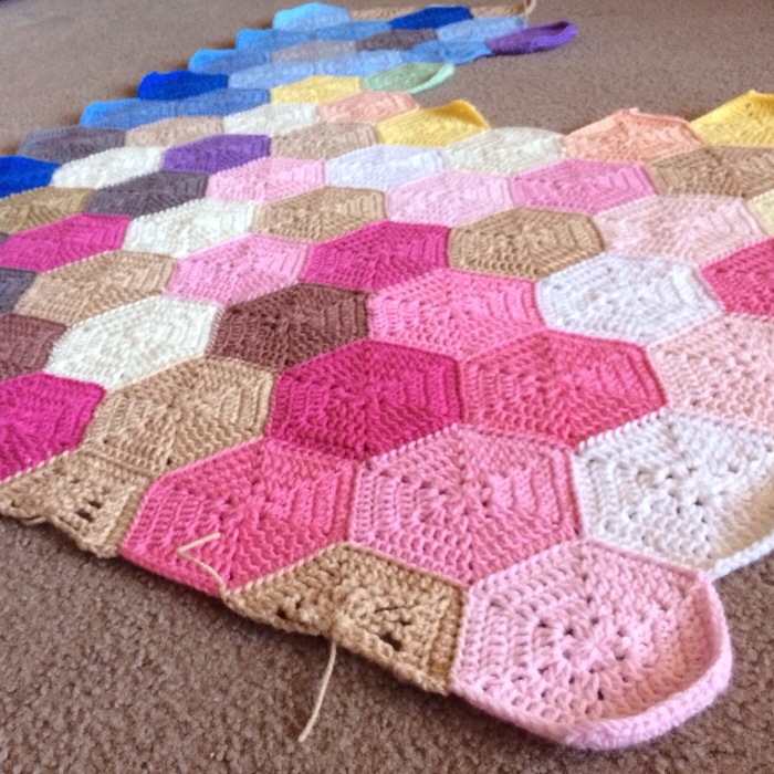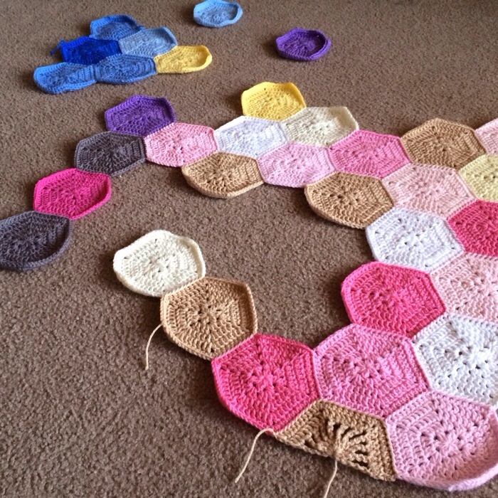 - Construction: Strong pastel palette hexagons joined as you go, squared off with a neutral color border
