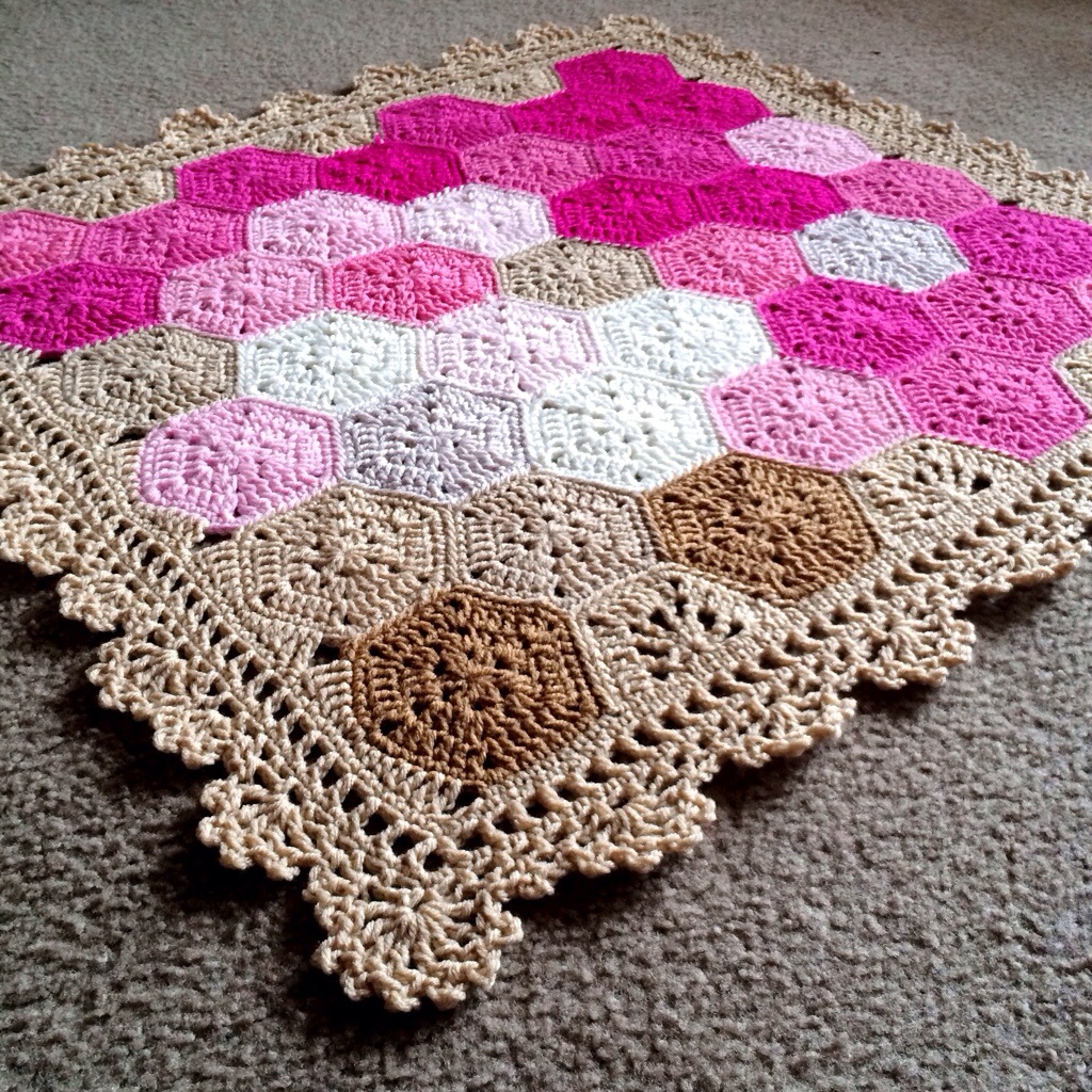 • Construction: Hexagons joined as you go, squared off with a neutral lace border that gives the blanket a warmth.