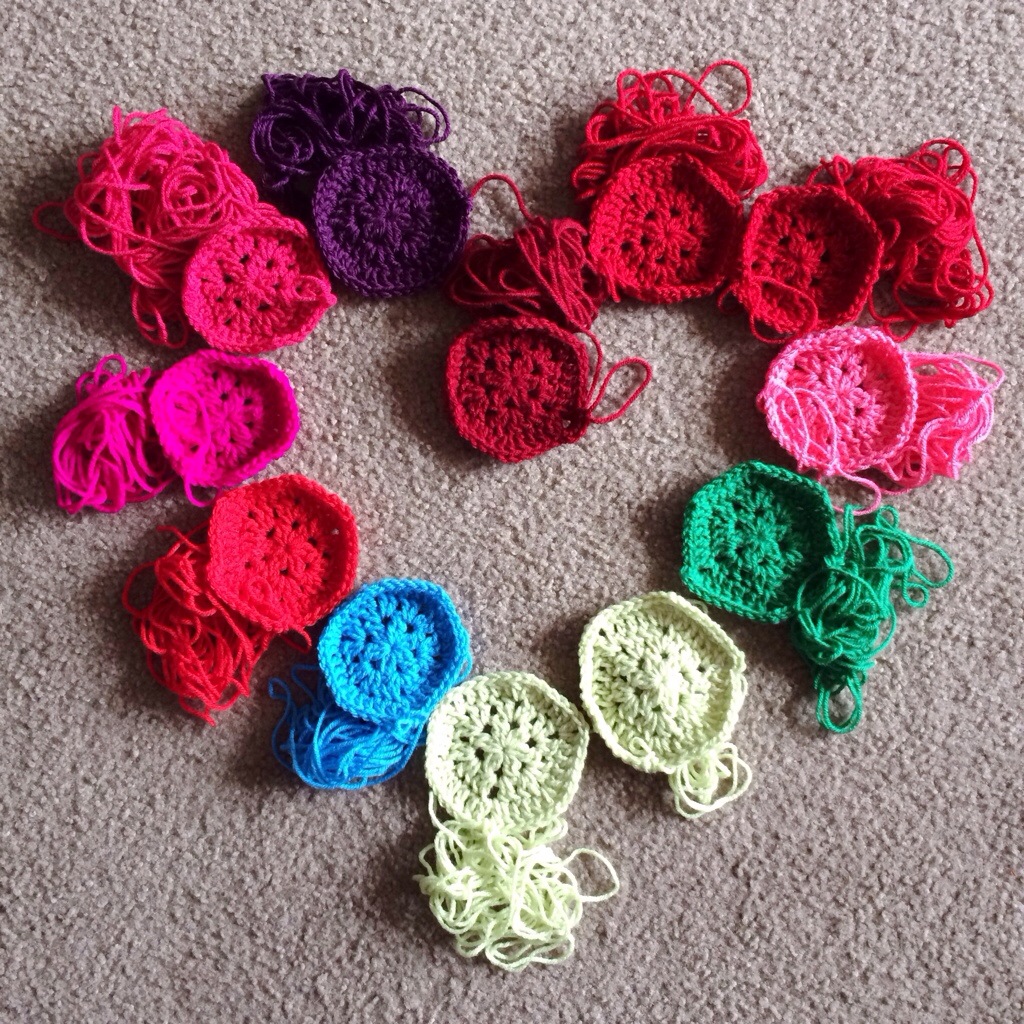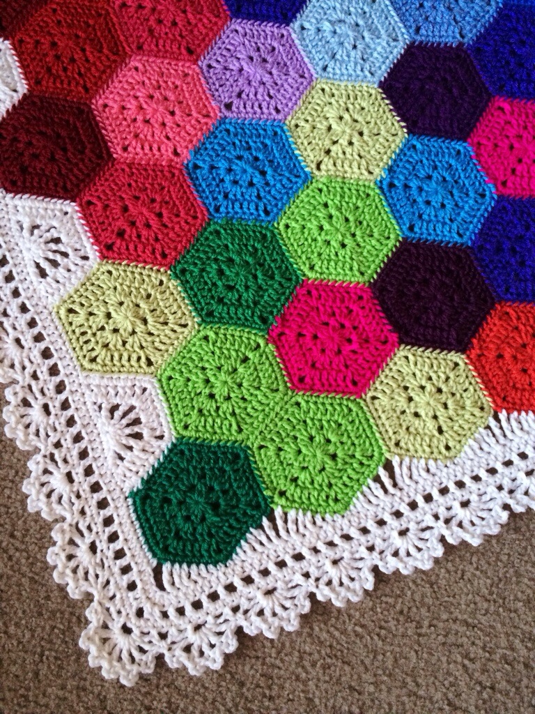• Construction: Hexagons joined as you go, squared off with a white lace border that sets off all that color.