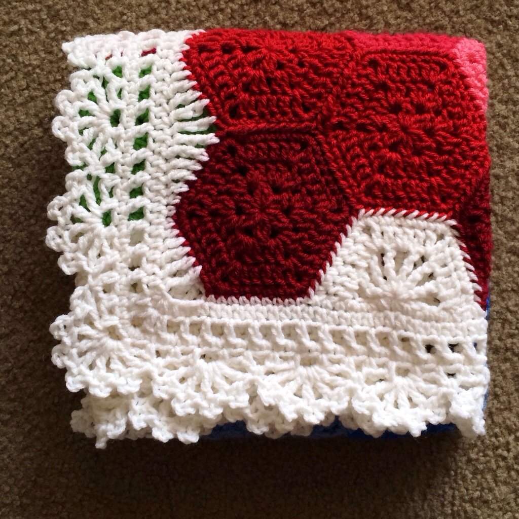 1. No, I haven’t written this exact border up, but it’s a lot like my Geometric Lace border – just with a (DC, Chain 1) “eyelet” round added in so that I could reach my dimensions. I used only lace shells that were 4 picots large, and I didn’t “line up” the border with the hexagons like I usually do, because I liked it better this way for this piece! 😊😊🐾🐾