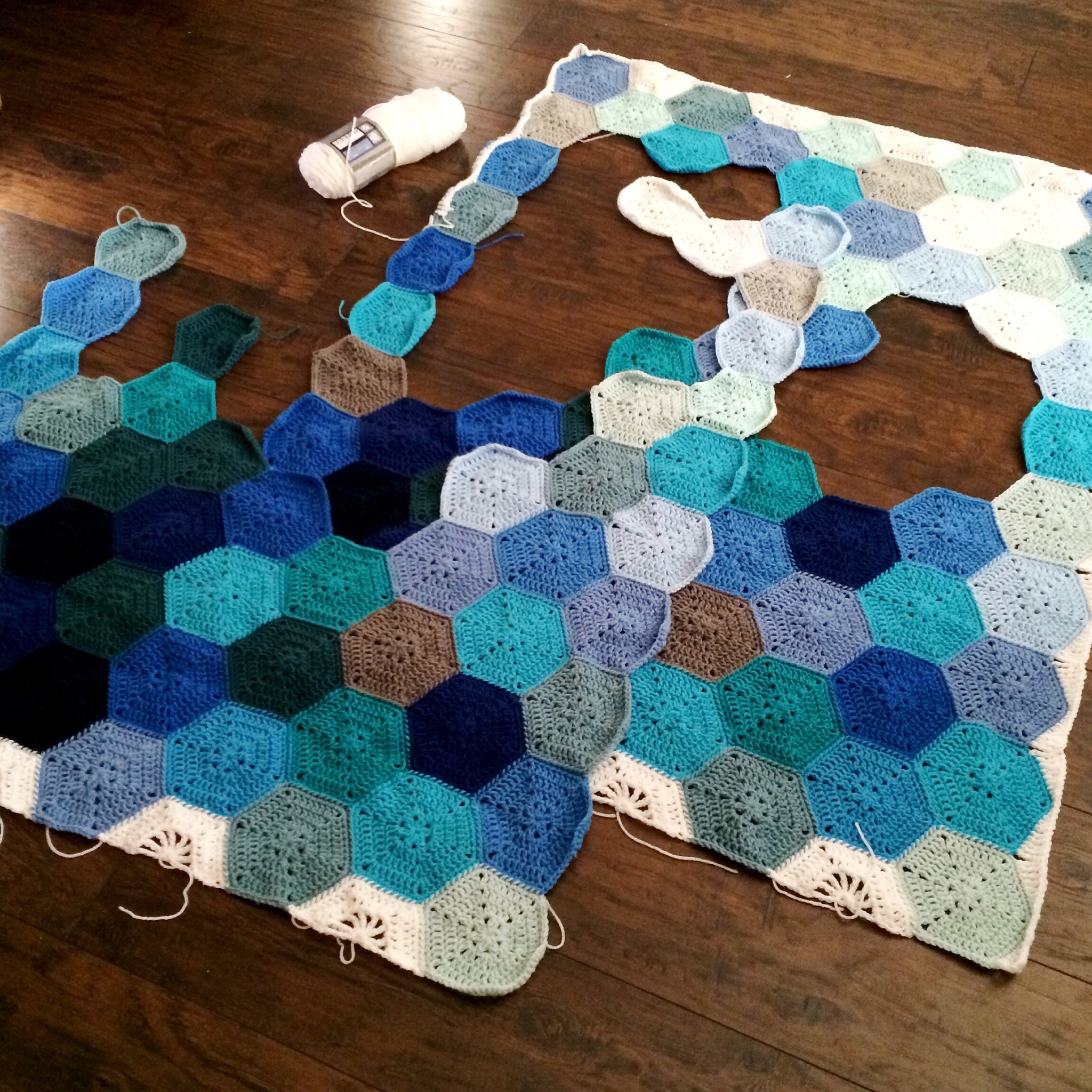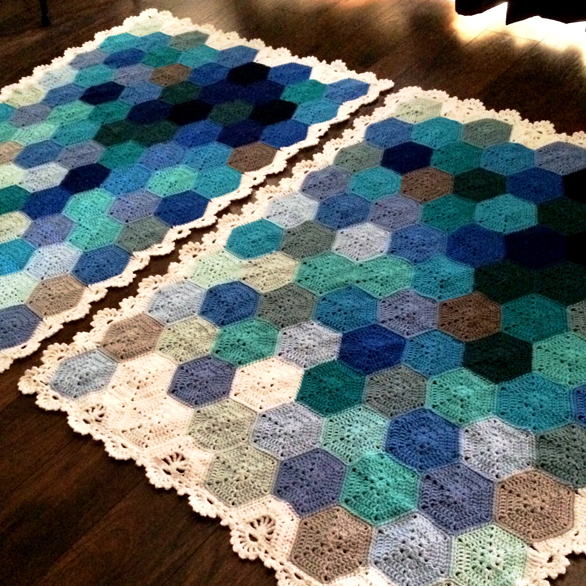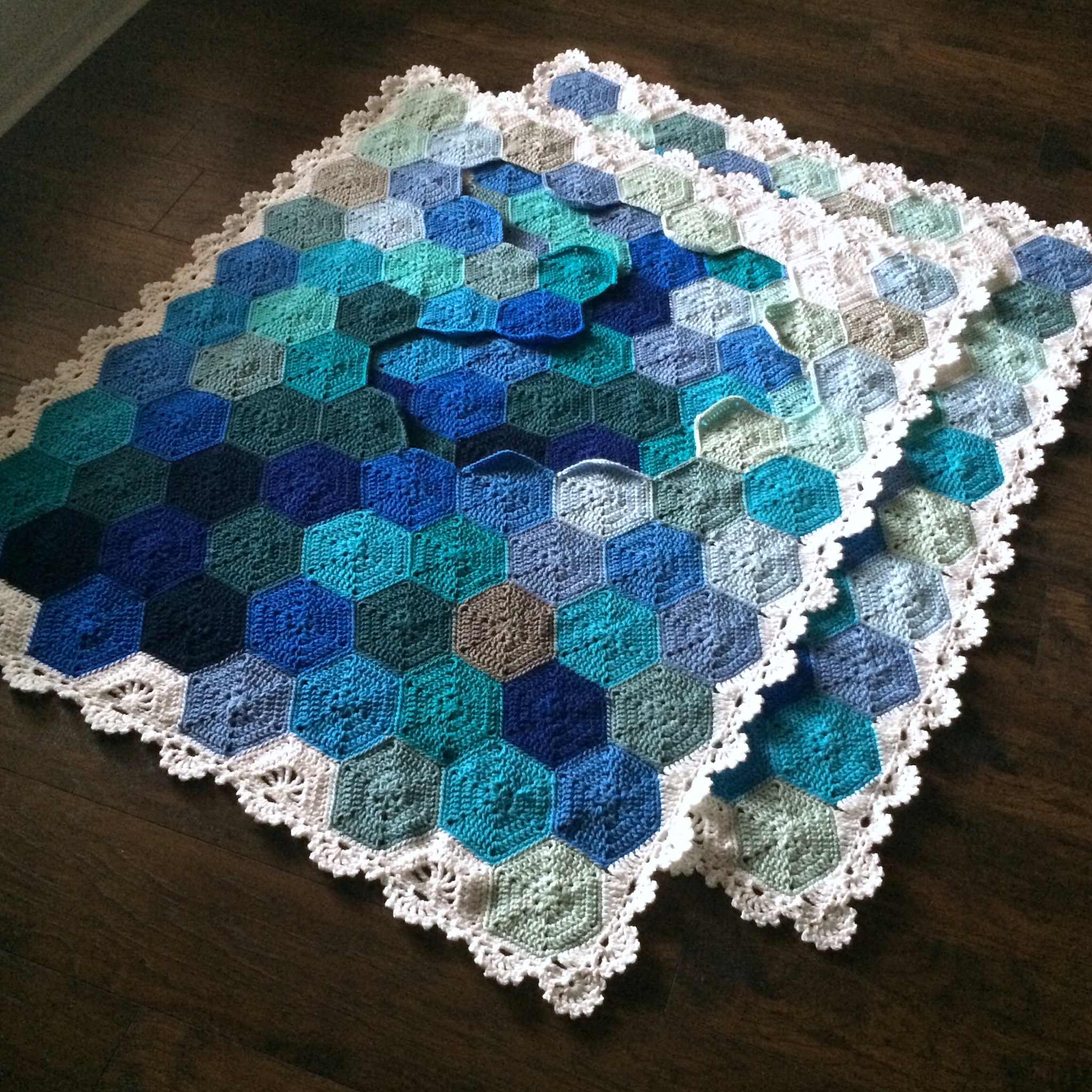 - Construction: Lovely shades of blue and aqua hexagons joined as you go, squared off with a white lace border that gives the blanket a crisp look. Then it was so nice, I made it twice! hehe