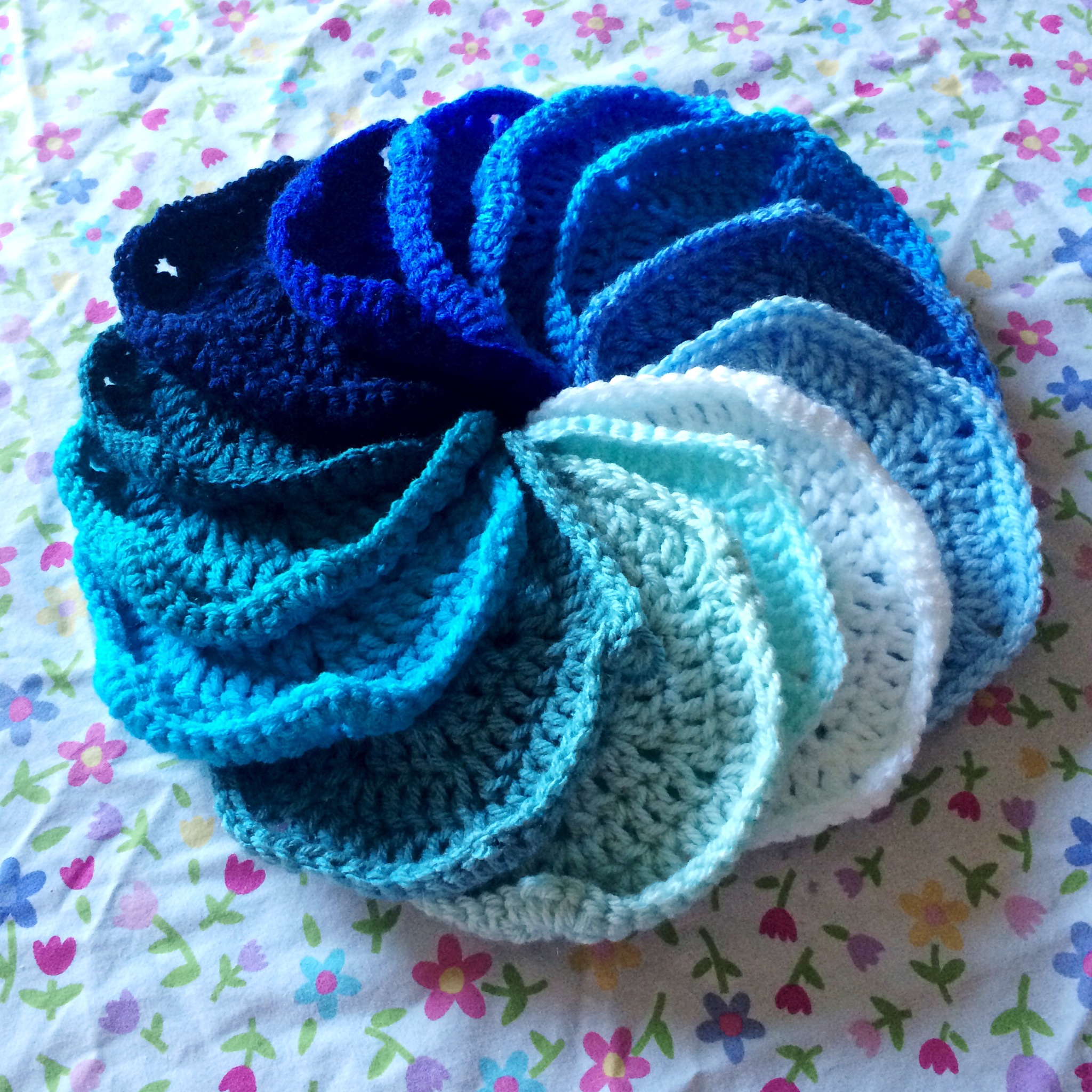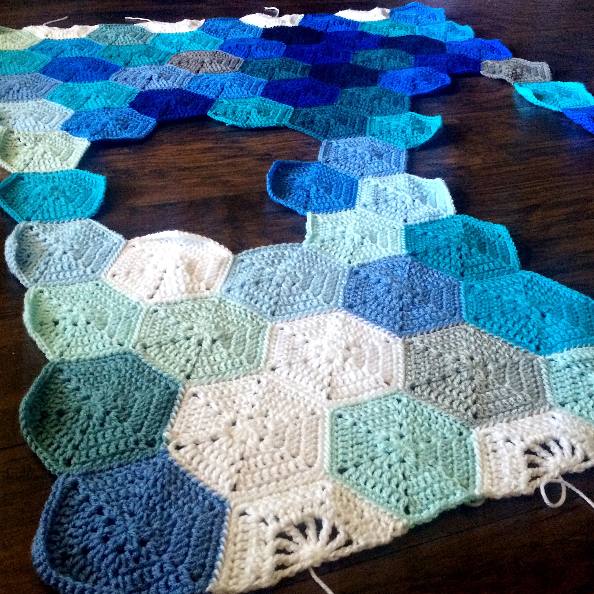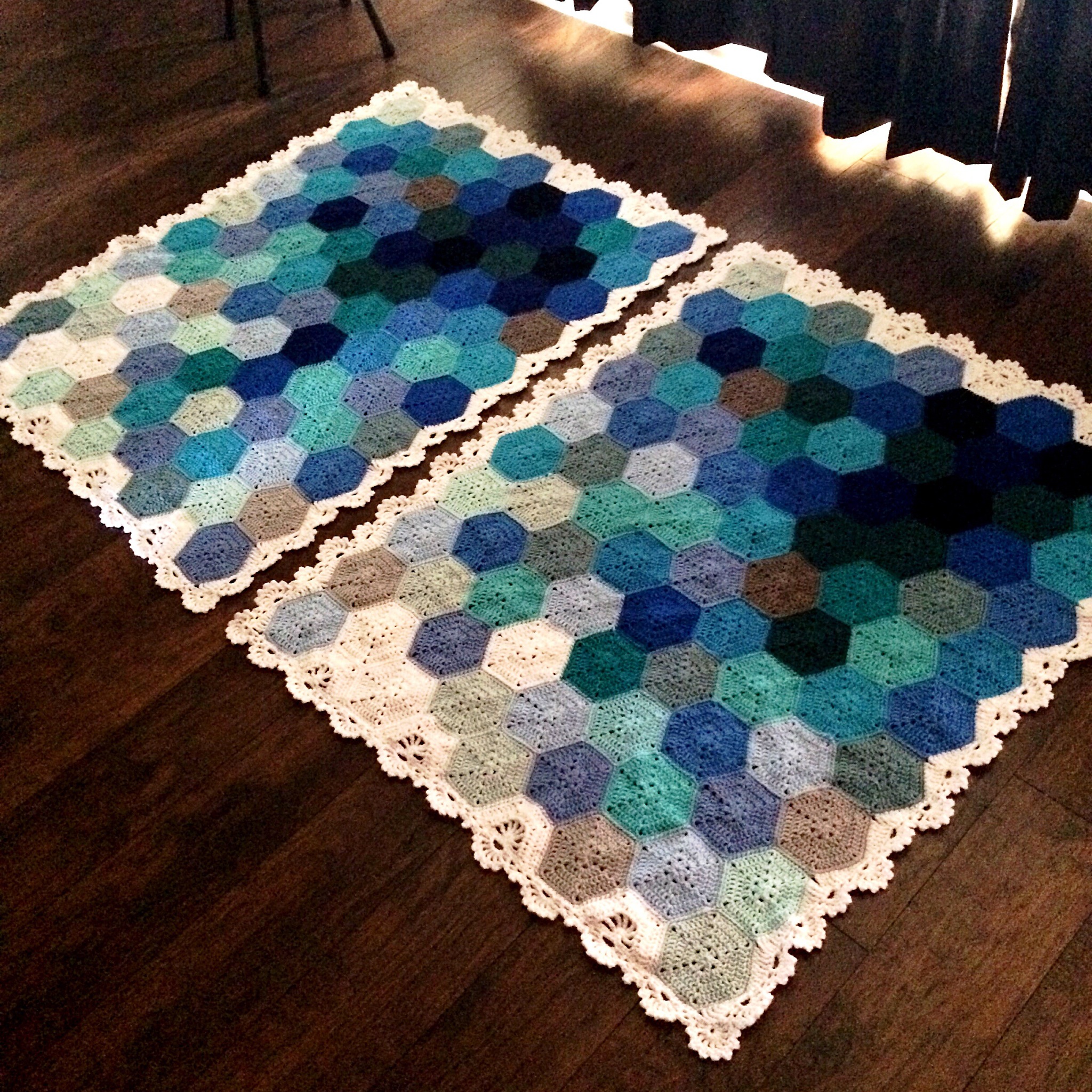 - Construction: Lovely shades of blue and aqua hexagons joined as you go, squared off with a white lace border that gives the blanket a crisp look. Then it was so nice, I made it twice! hehe