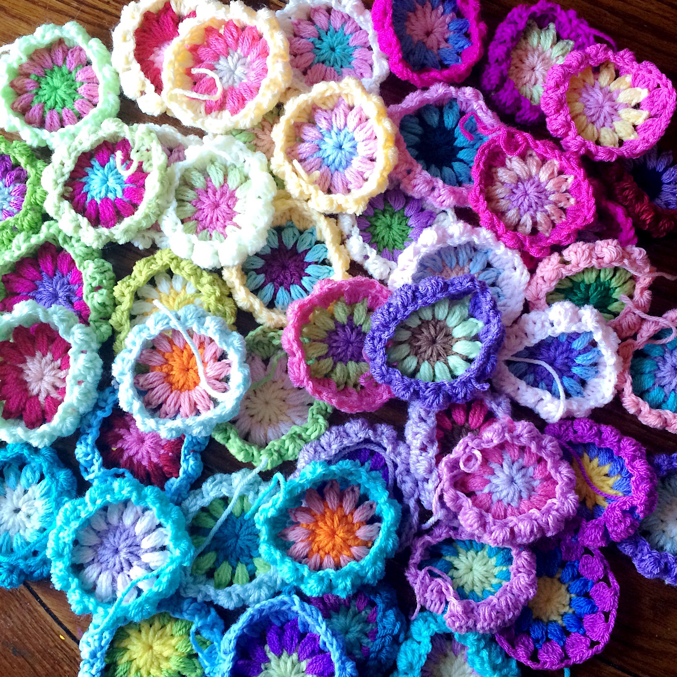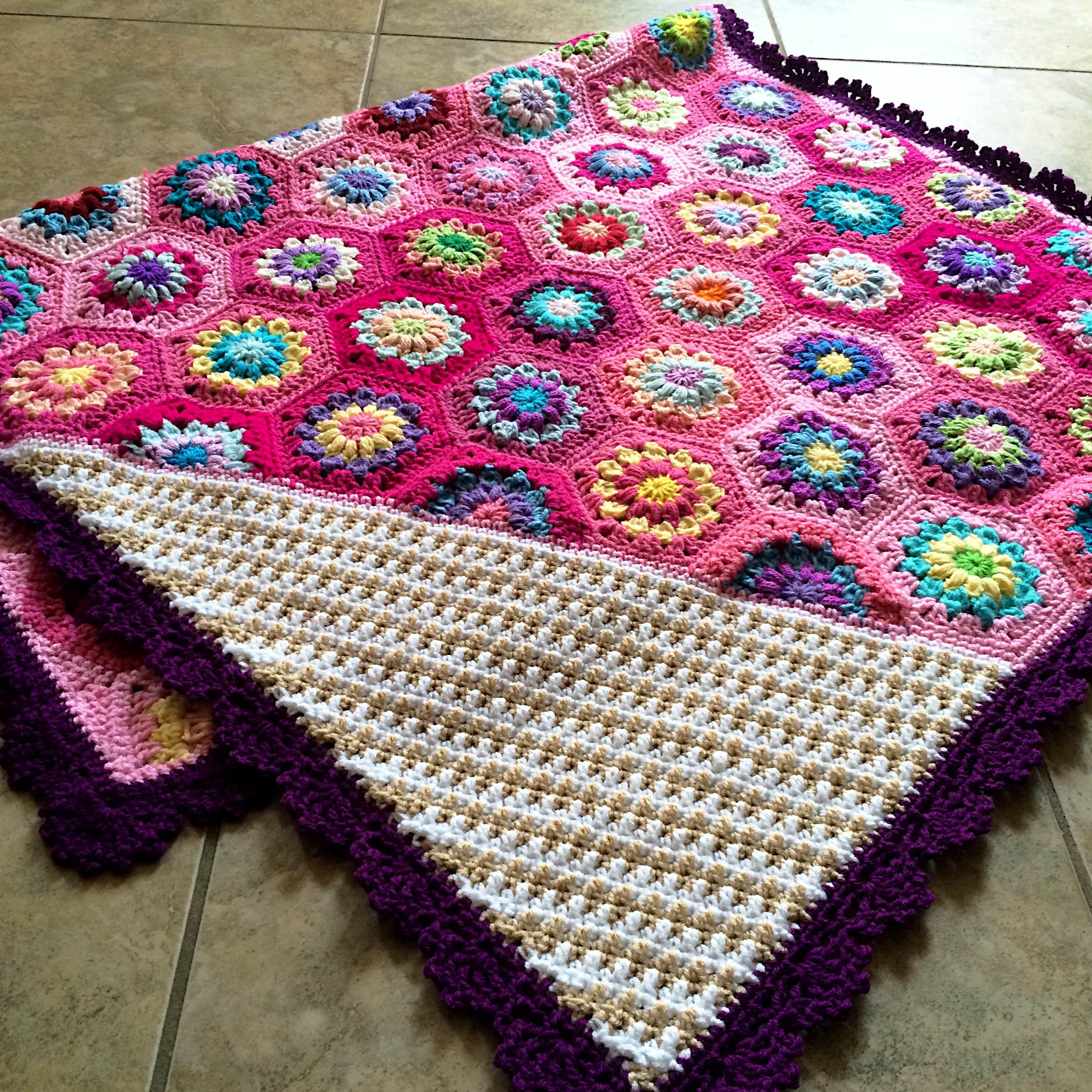 - Construction: Hexagons joined as you go, squared off with half-hexagon motifs, replacing one corner’s motifs with diagonal stripes and adding a lace border as the edging.