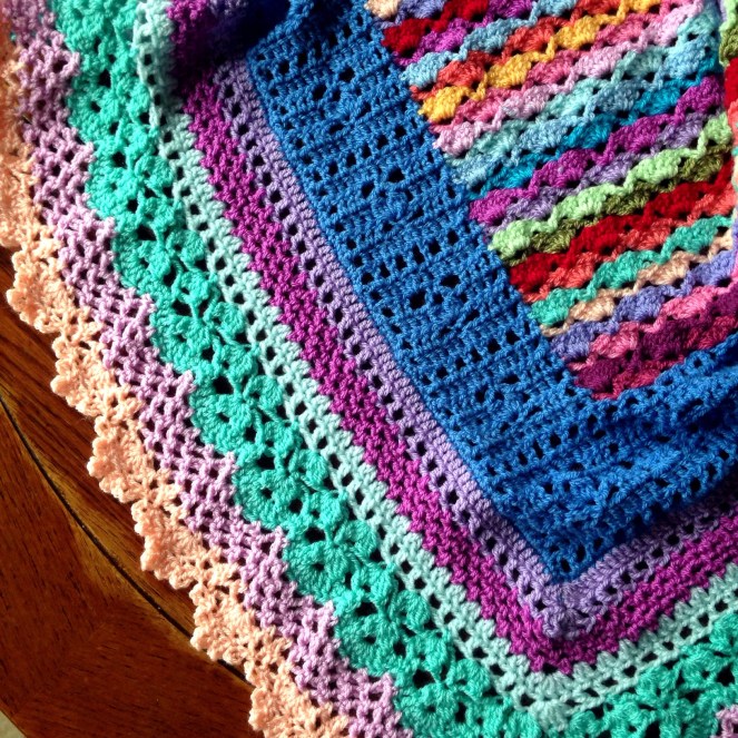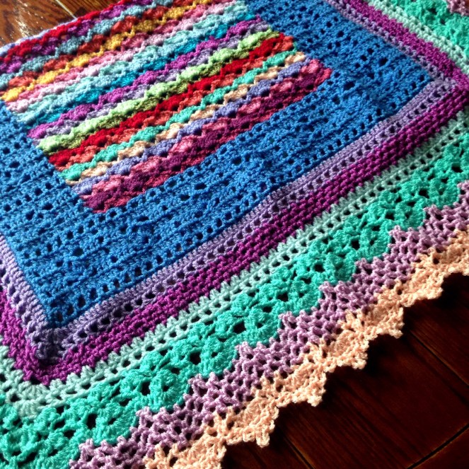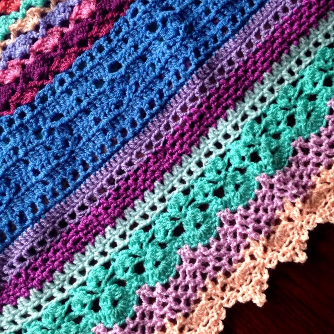 Vibrant Vintage is a colorful reboot of traditionally solid pastel lace baby blanket patterns. For this piece, I used Stylecraft Special DK and New Fashion DK with a size 5mm hook.