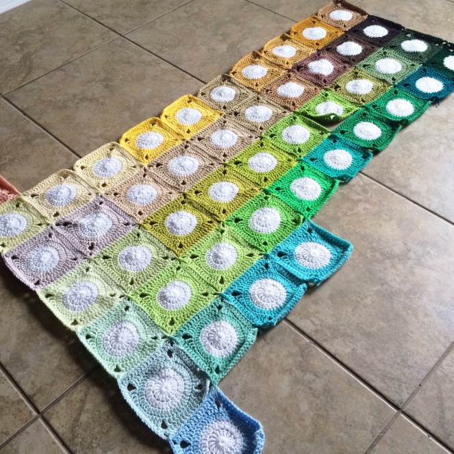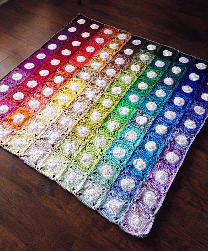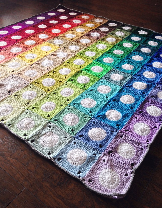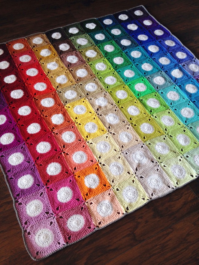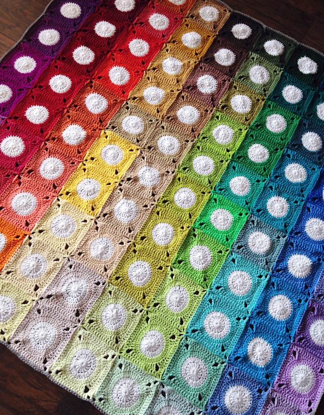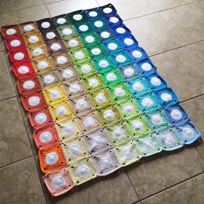 White Circles Blanket – From the Gumball Blanket Pattern, with white at the center circle of each square. – Original above! New piece has 100 squares with about 80 unique shades.