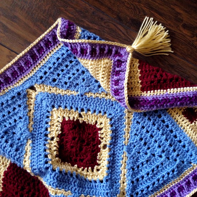 • Materials: Red Heart Super Saver (I buy from knitting-warehouse.com for a softer product!) and Yarn Bee for the golden parts