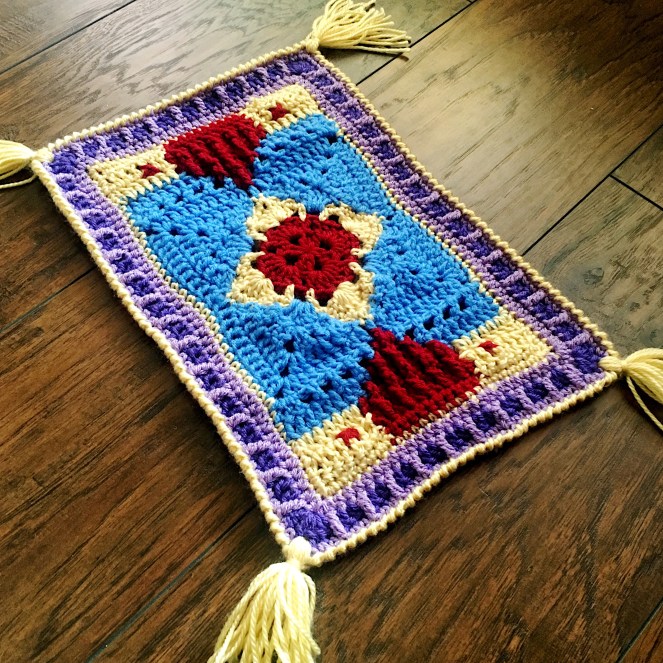 Check out this post for details on this blanket, but I may just write up a guide for the mini version! It’s perfect for doll play or to complete an Aladdin/Disney table centerpiece.