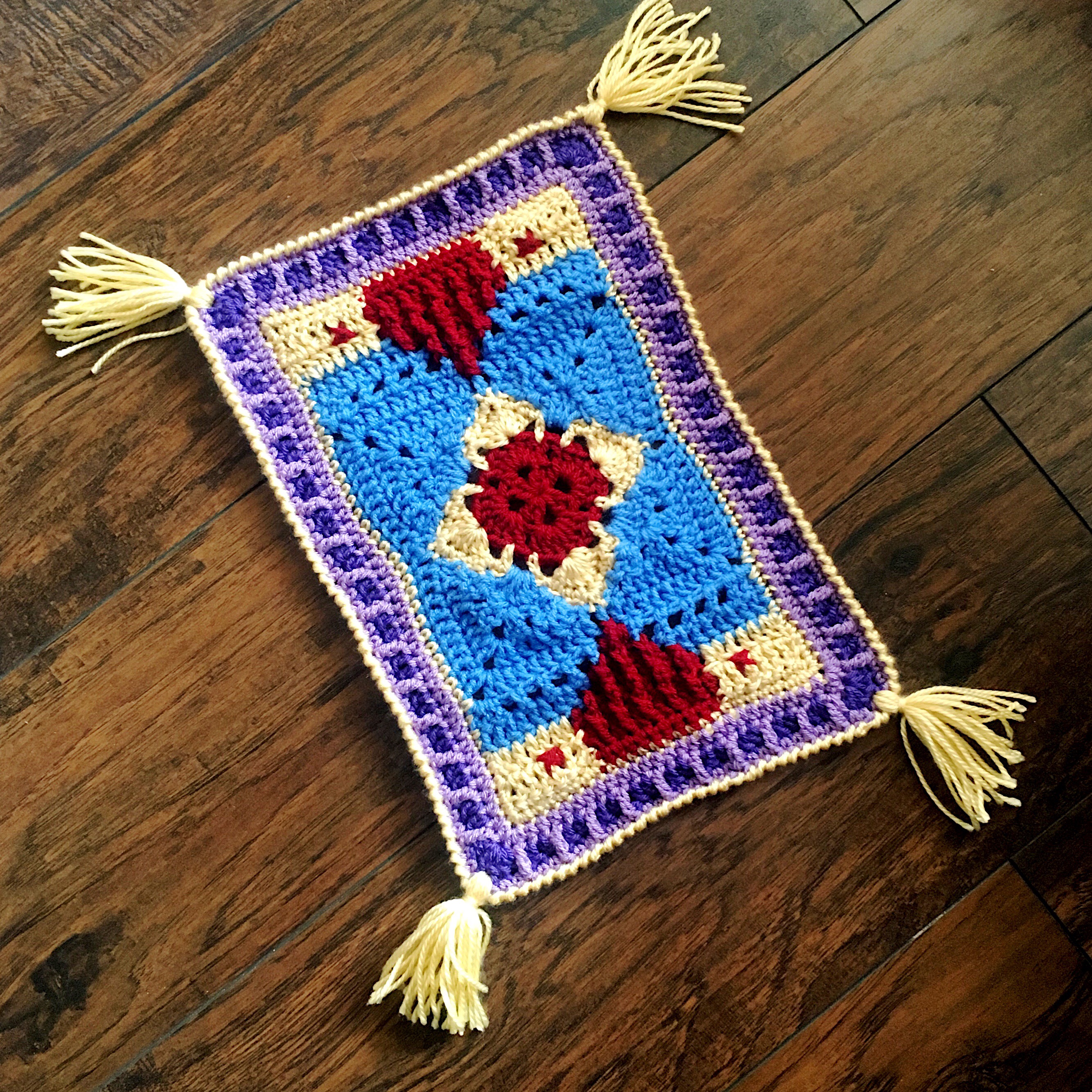 Check out this post for details on this blanket, but I may just write up a guide for the mini version! It’s perfect for doll play or to complete an Aladdin/Disney table centerpiece.