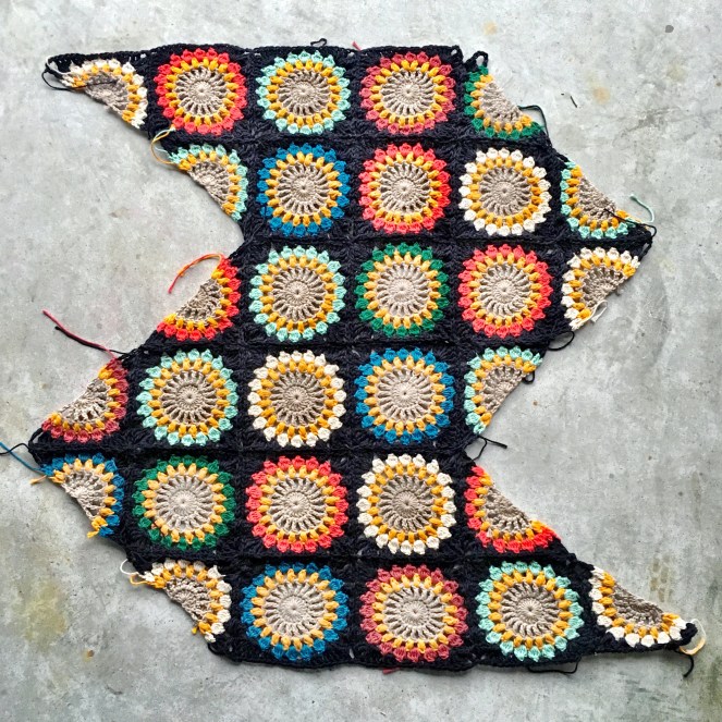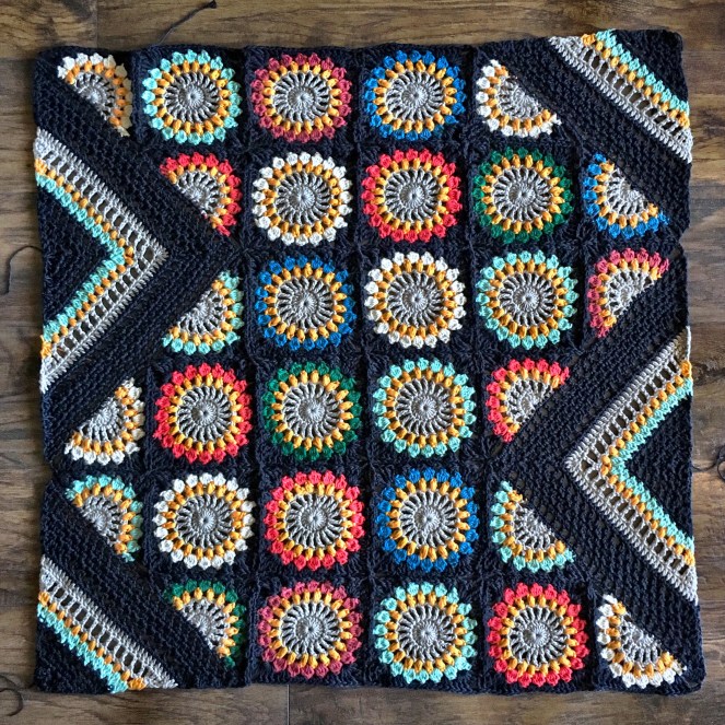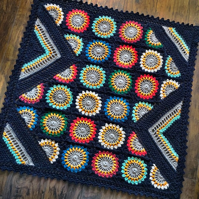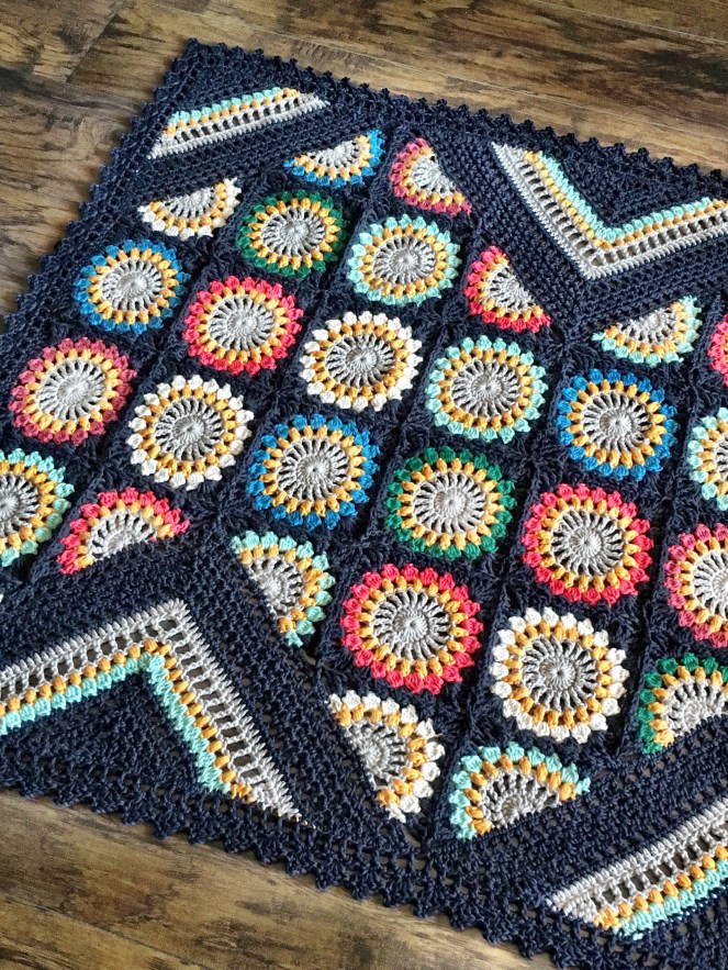 Finished Blanket is 40x40in – yarn details are in the intro to the pattern – Yarn brand is Shiny Happy Cotton by wool and the gang.