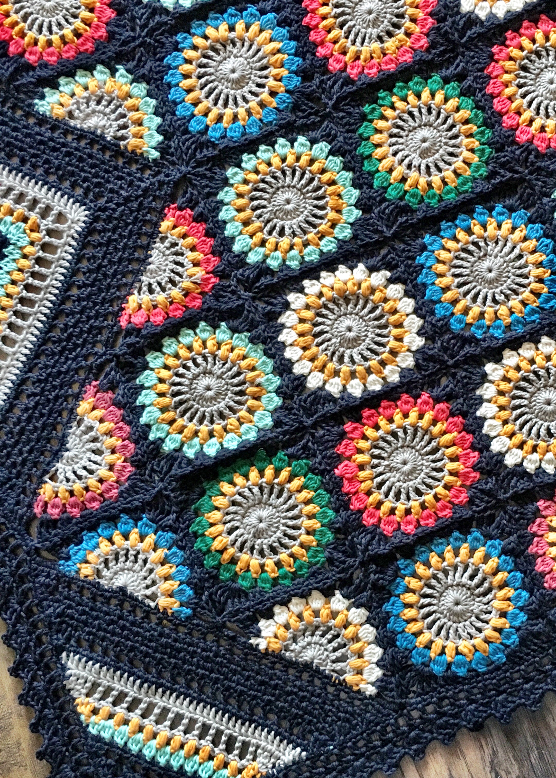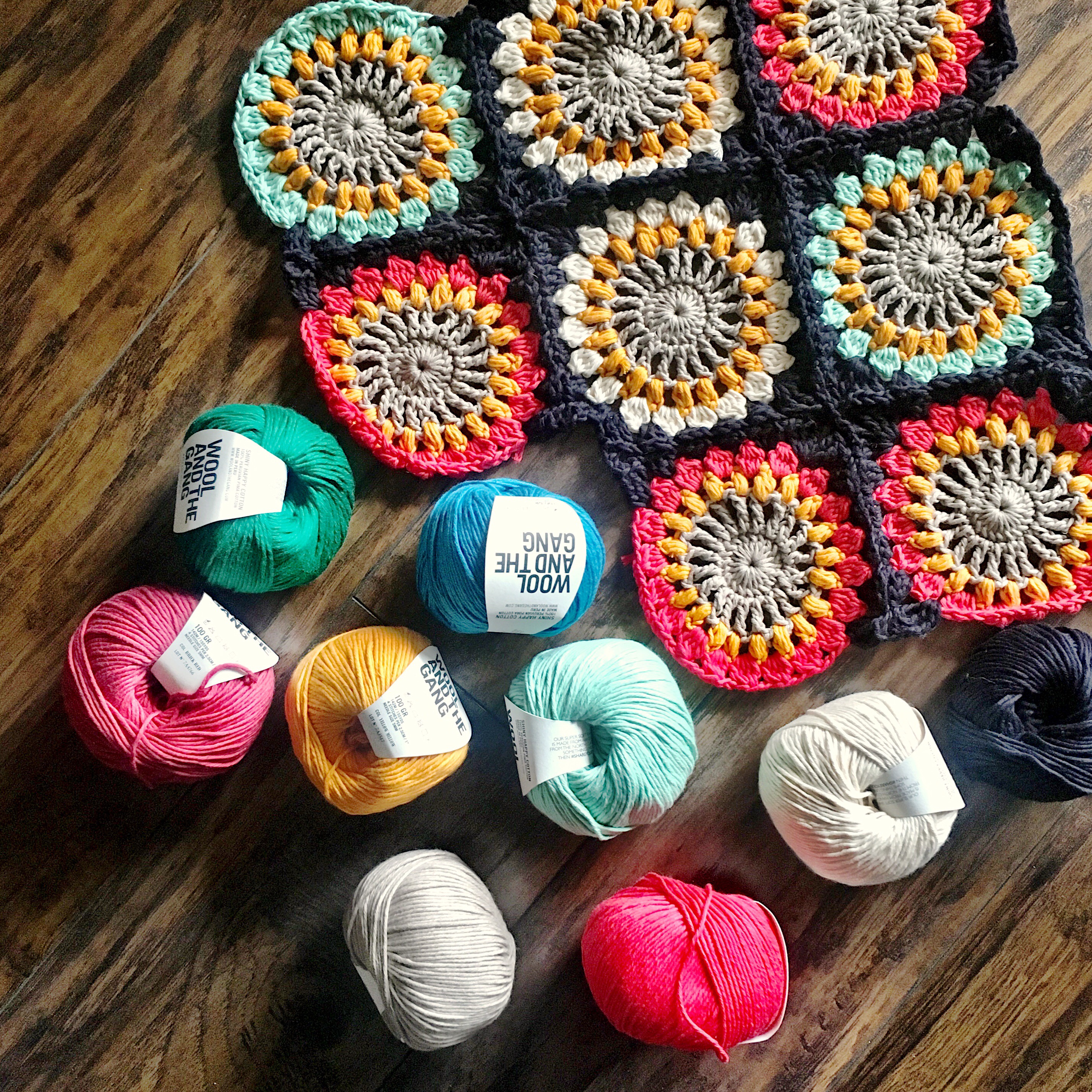 Finished Blanket is 40x40in – yarn details are in the intro to the pattern – Yarn brand is Shiny Happy Cotton by wool and the gang.