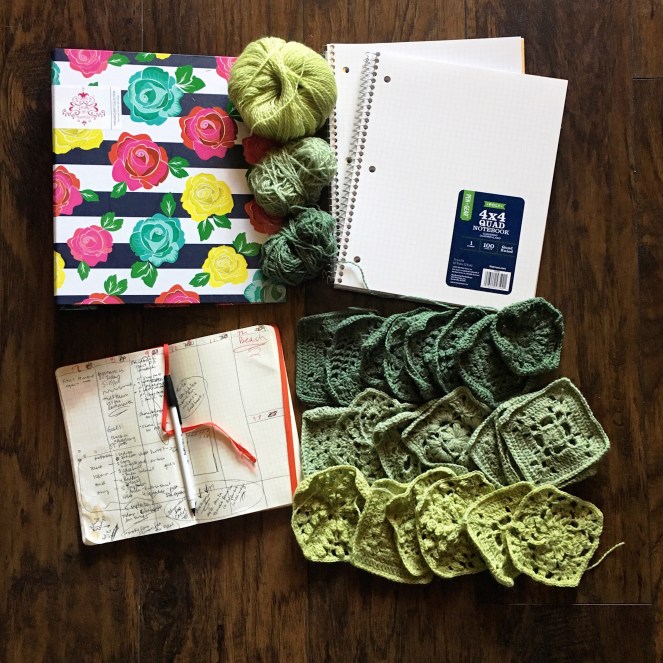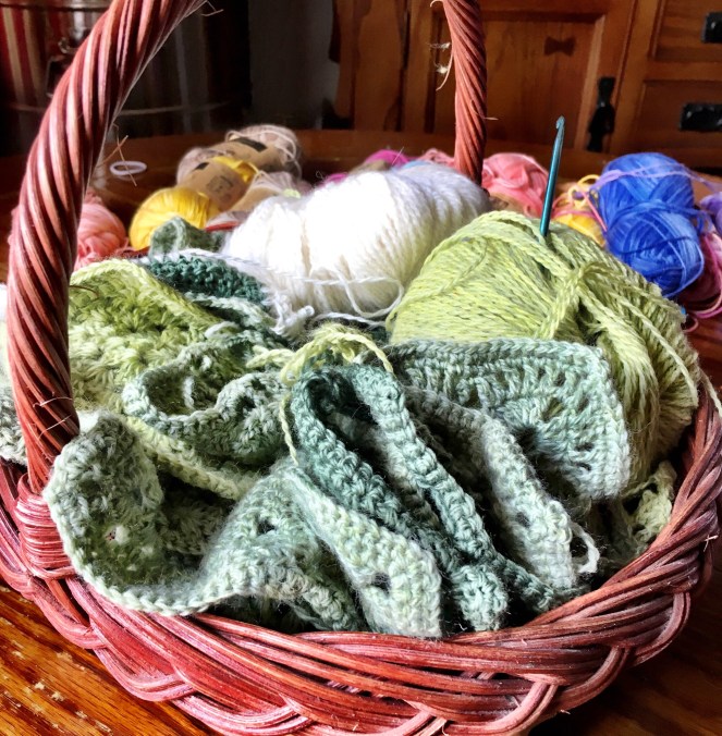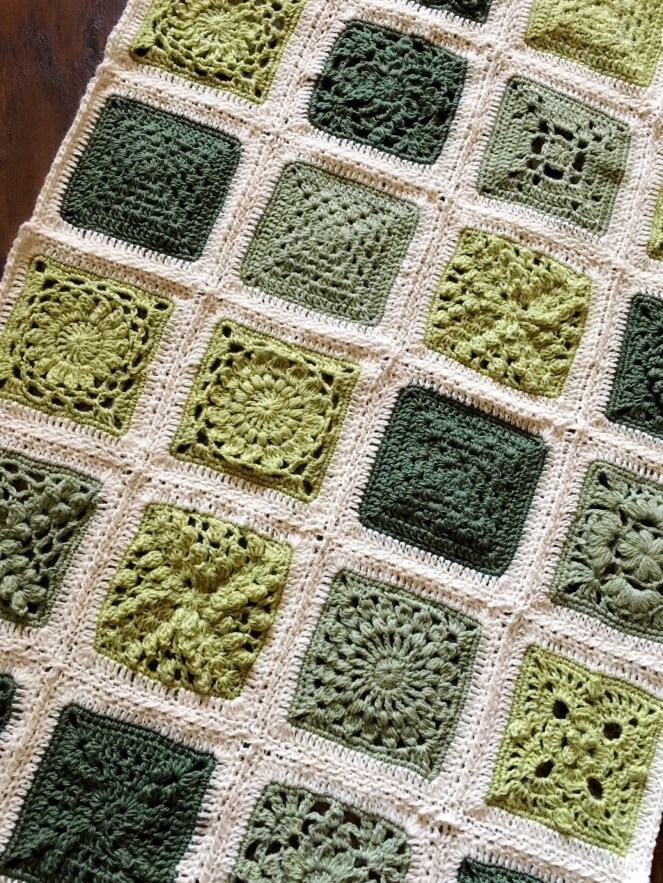 This blanket was a joy and also a labor of love! I used KnitPicks Palette yarn, and 3 shades of green for the 54 squares.