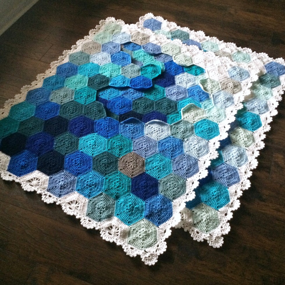 Design Profile Pattern: Geometric Lace Materials: Hobby Lobby “I love this yarn” and Red Heart Super Saver (I buy from knitting-warehouse.com for a softer product!) Size: 49x64in Construction: Lovely shades of blue and aqua hexagons joined as you go, squared off with a white lace border that gives the blanket a crisp look. Then it… Continue reading Geometric Lace No. 41 & 42