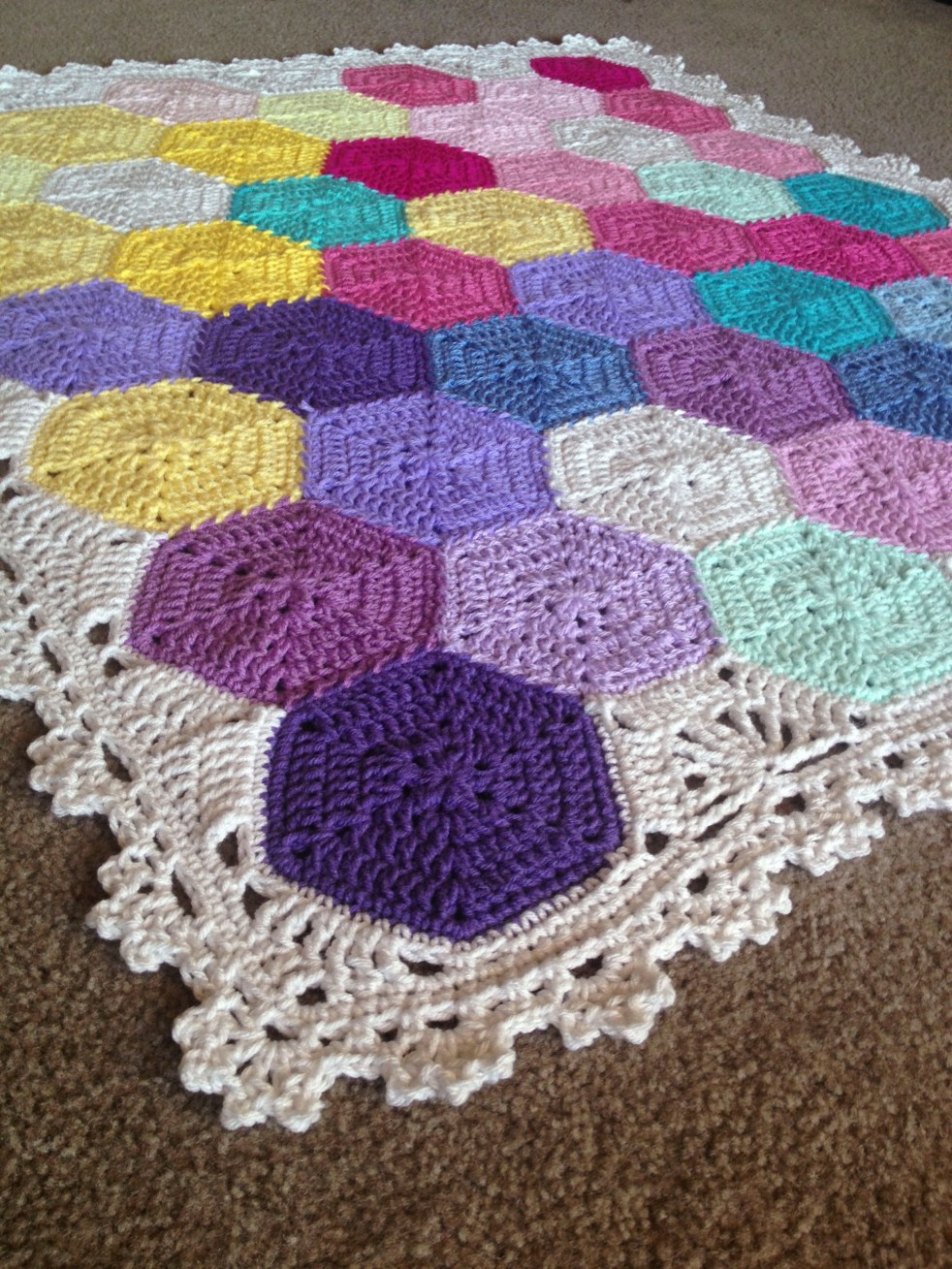 Geometric Lace headed to Florida! Love this one with the floral detail. Check out the pattern for sale on Ravelry and Etsy, or look into buying this blanket as a custom, handmade item. The borders on this motif absolutely square the edges - check out the motif without any adjacent hexes attached! The petals are… Continue reading Geometric Lace 14