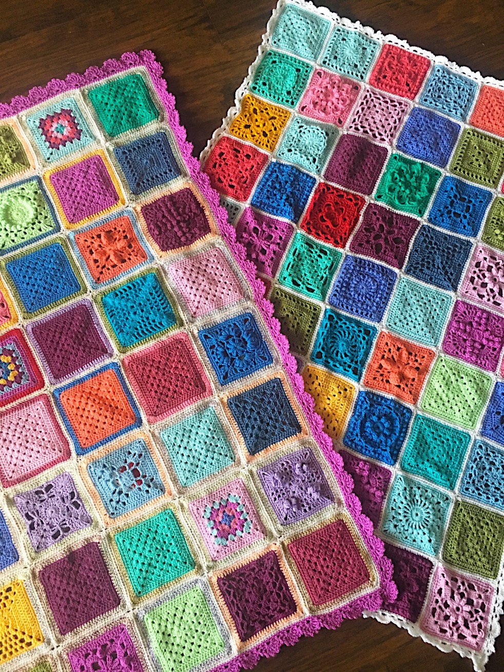 VVCAL Free pattern - 33 different granny squares and various joining methods and a wide lace border with unique corners. Try this pretty edging in a built tough, but super soft DK weight yarn like: Scheepjes Colour Crafter Knitpicks Brava Sport Stylecraft Special DK Find more VVCAL blankets here! They’re so fun to make and… Continue reading Vibrant Vintage No. 9 and 10